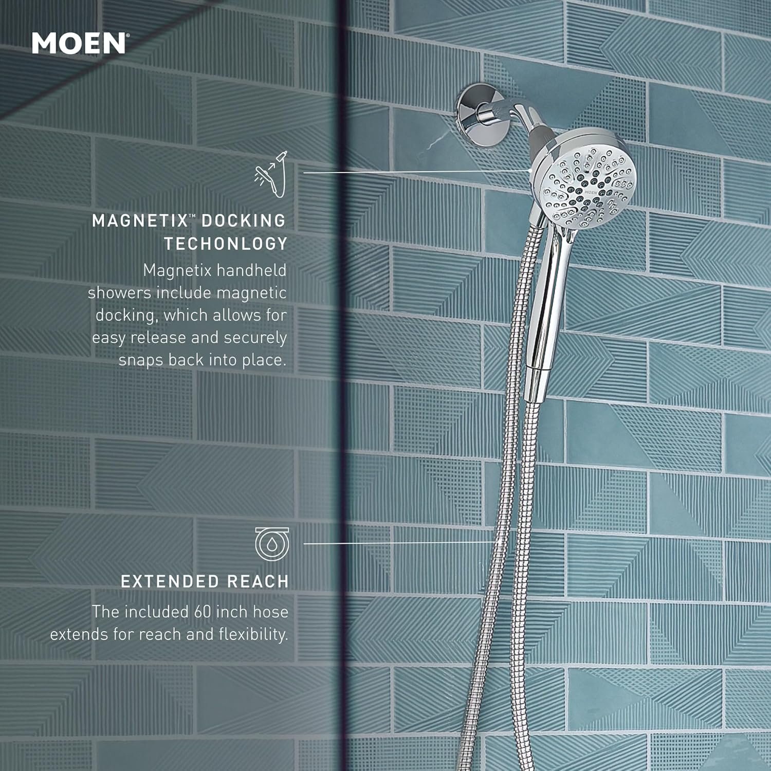 • Magnetix Docking: Snap the Moen Engage handheld sprayer into place magnetically, for one-handed operation every time. Great for families and accessible use.