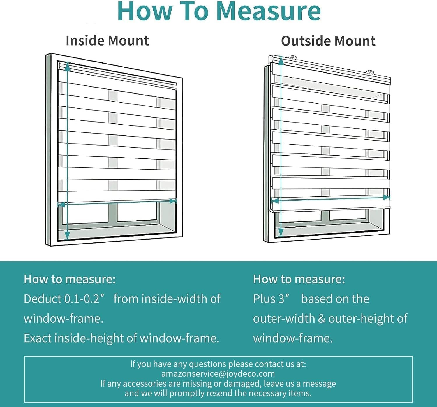 The product can be mounted inside or outside the frame. For inside, deduct 0.1″ from your window width. For outside, add at least 3 inches to the width for full coverage.