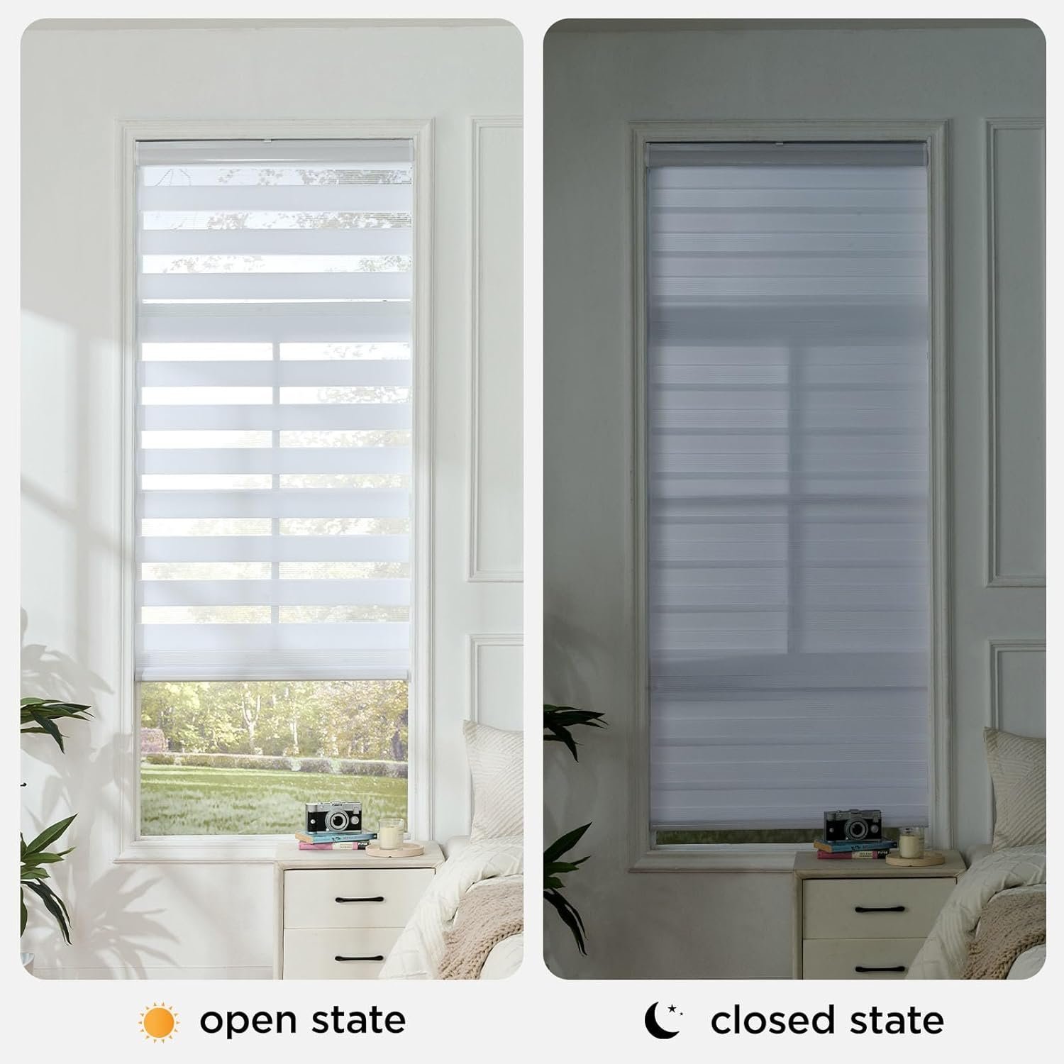 • Dual-Layer Light Filtration: The alternating sheer and privacy bands allow for easy transition between room darkening and gentle filtered light in your office or bedroom shades.